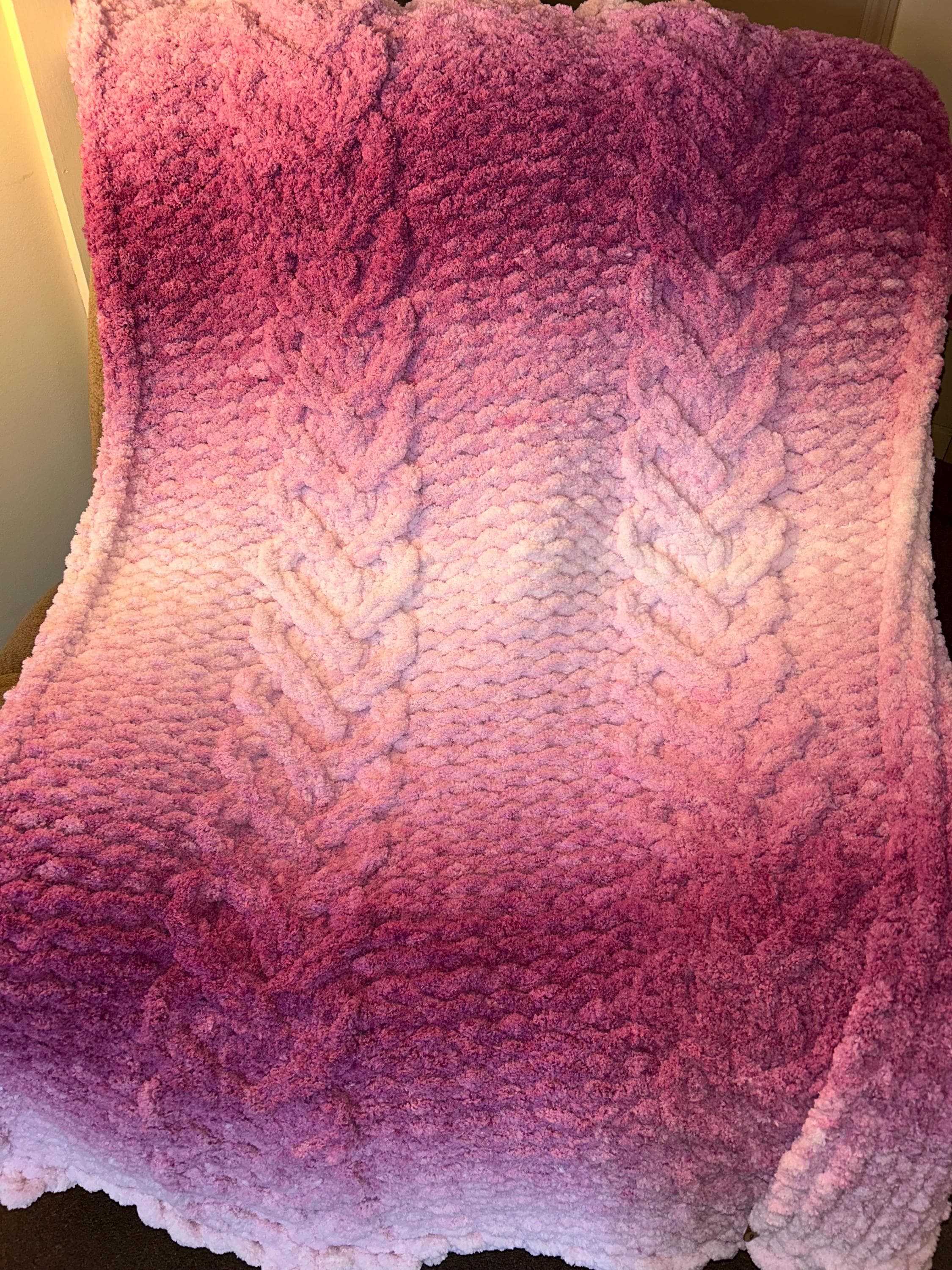 Hand-crafted with ultra-soft, oversized yarn, this 50×60 inch throw features a beautiful ombré gradient that gently shifts from light to deep tones, creating a cozy, modern statement piece for any space. Two rows of delicately sculpted knit hearts add a touch of romance and charm — making it a meaningful gift or a stunning décor accent.