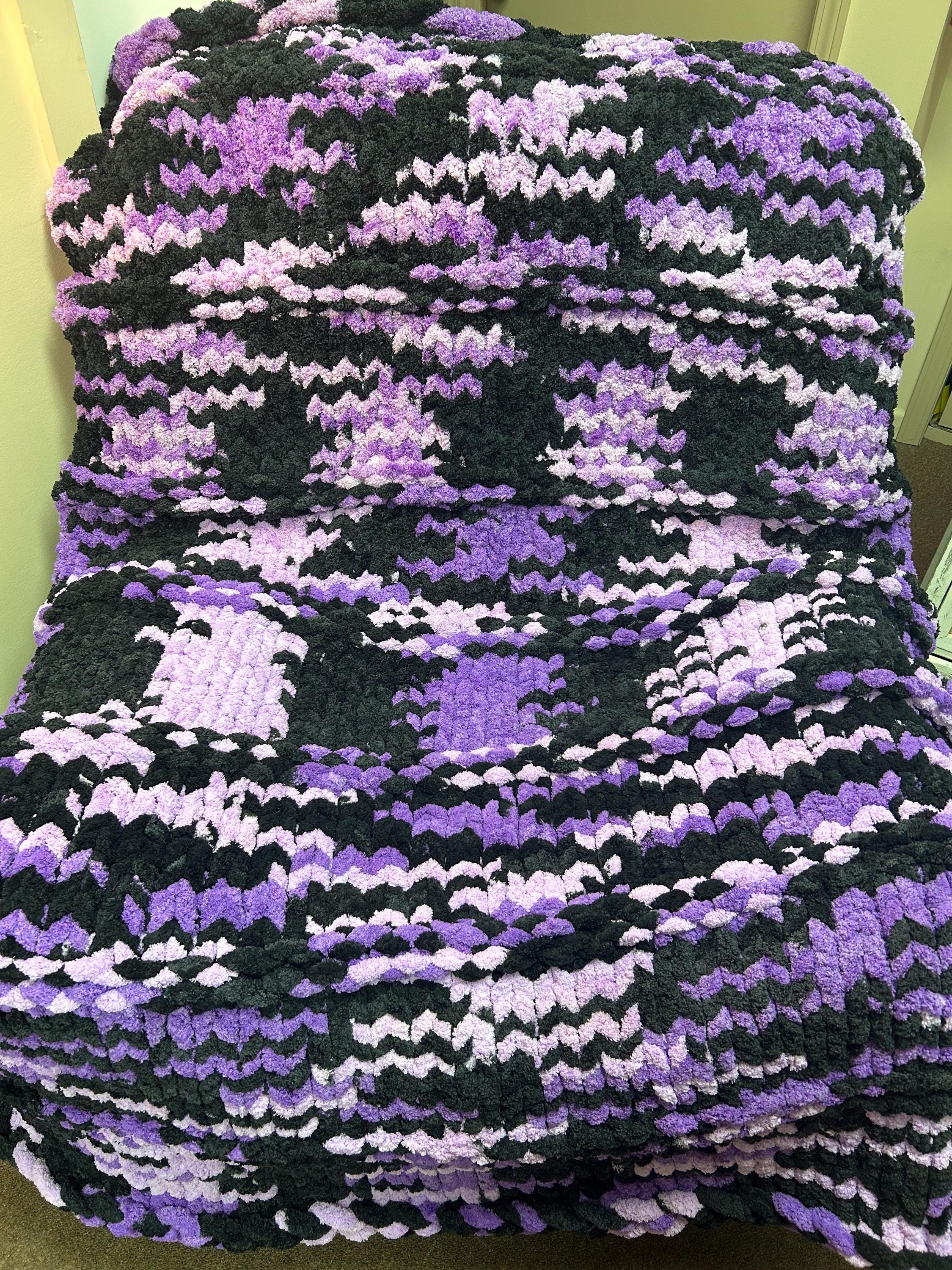 Purple and black variegated handmade chunky knit blanket with garter stitch accent design!