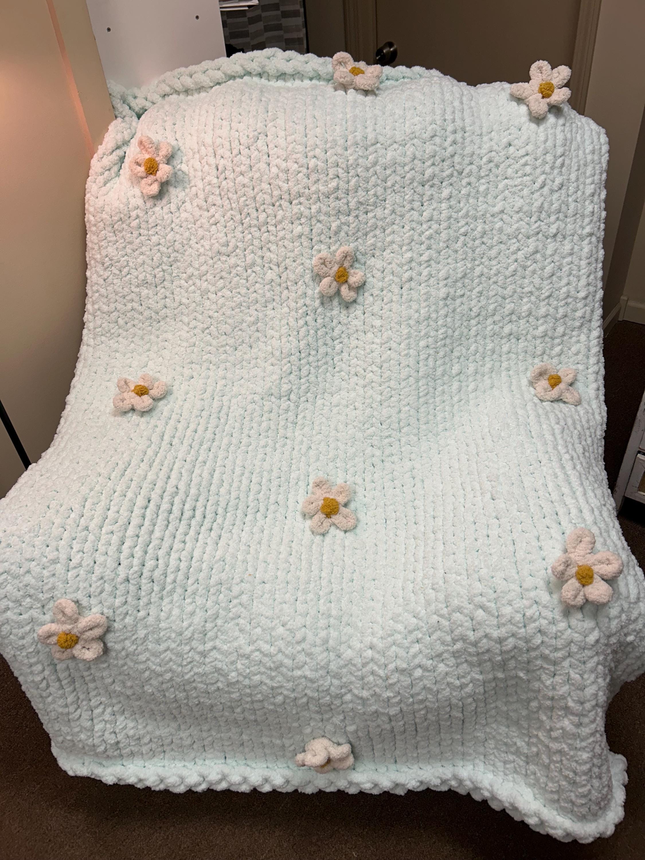 Ice blue/green blanket base with ivory daisies!